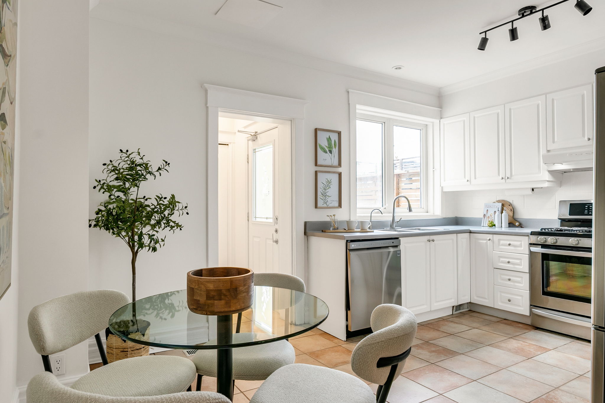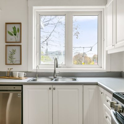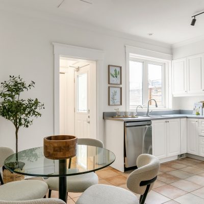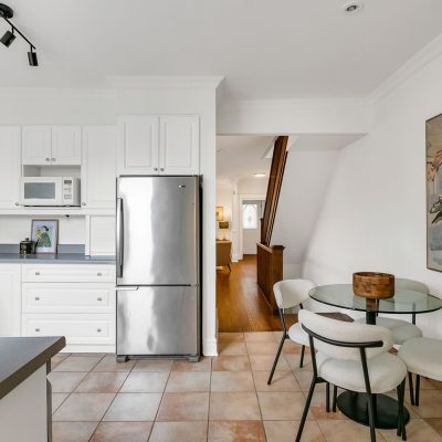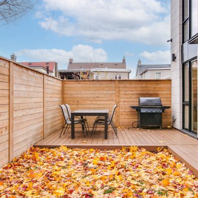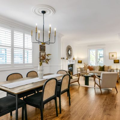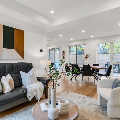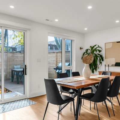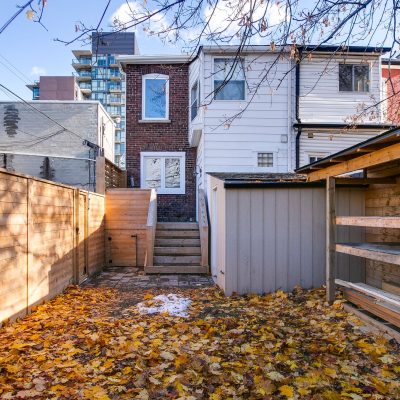 Fronting Moberly, this 1910 semi-detached home pairs classic East End character with modern functionality across three levels of well-loved space. High ceilings, hardwood floors, and a gas fireplace set the tone, while the living and dining rooms carry original details — crown mouldings, medallions, and tall baseboards — that give the home its quiet gravitas. The ample eat-in kitchen with stainless appliances, gas range, and ample storage accesses the landscaped rear yard past a mudroom with storage and powder room. The kitchen and yard are awash with the setting sunlight for romantic times. Upstairs, three full bedrooms bask in natural light. The primary suite enjoys a bay window walkout to a rooftop deck that catches east-facing sun, while the rear bedroom opens to a vaulted sunroom perfect for coffee, reading, or quiet work-from-home time. A full bath — tiled floor-to-ceiling with Greco-Roman flair — and a double hallway closet round out the upper level. The finished lower level adds flexible living space with a rec room, den, bedroom, and laundry. Plans are provided to add a separate entrance and convert the home to two self-contained units. Out back, a surprisingly private yard links the home to the laneway residence beyond — landscaped with stonework, soft plantings, and maple shade. There’s a huge powered shed with water, a gas bib for grilling, and multiple seating areas — a private extension of the home that links seamlessly to the modern laneway residence behind.
