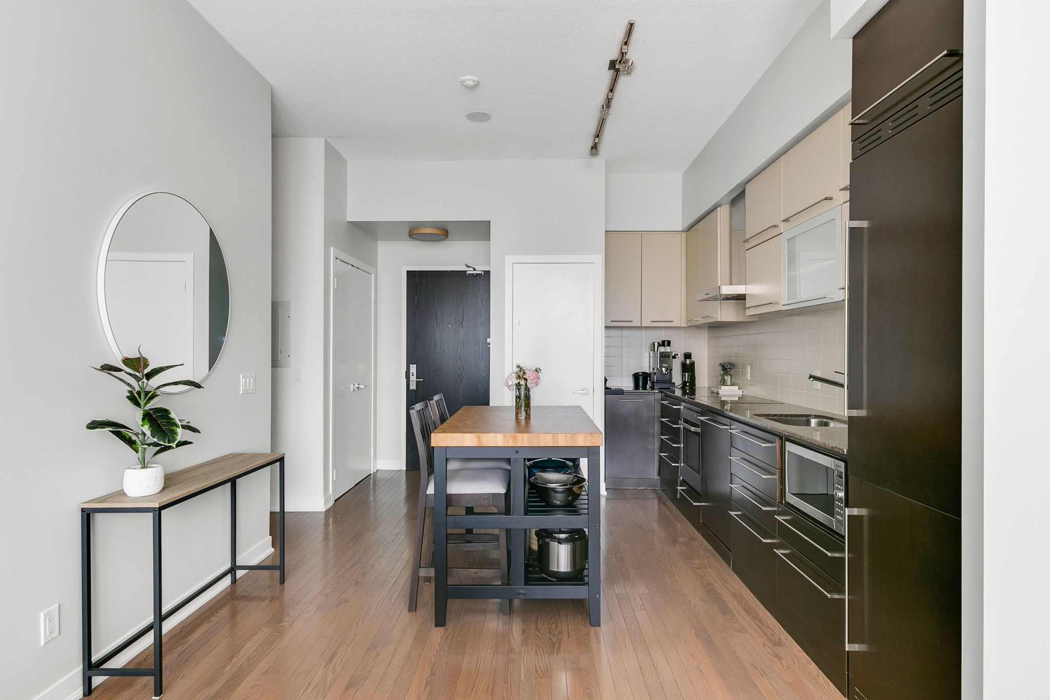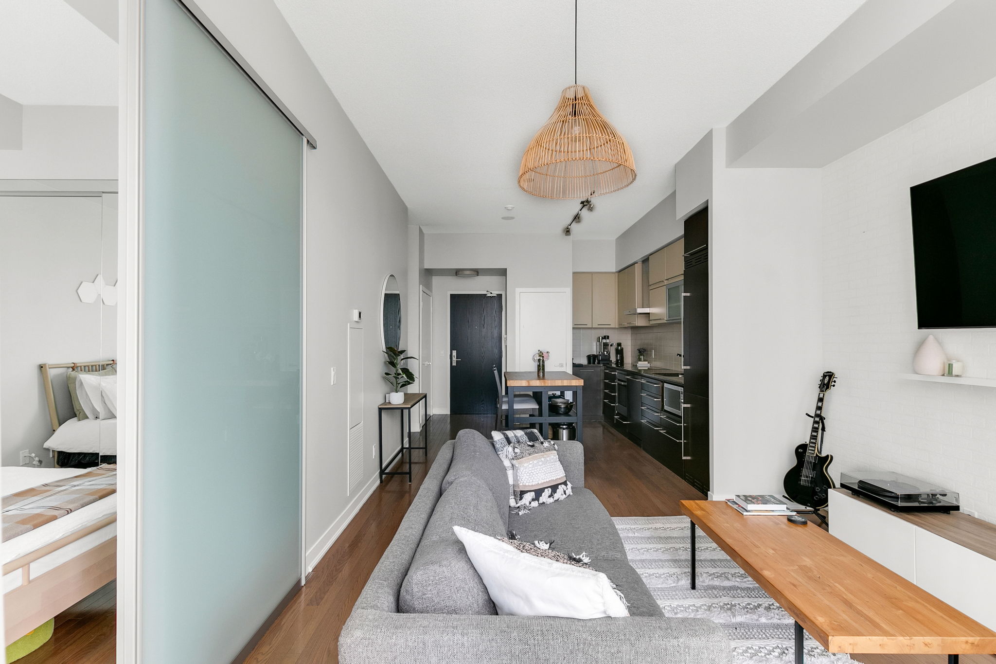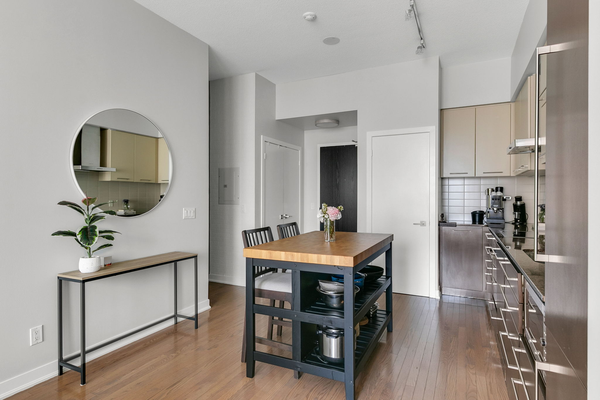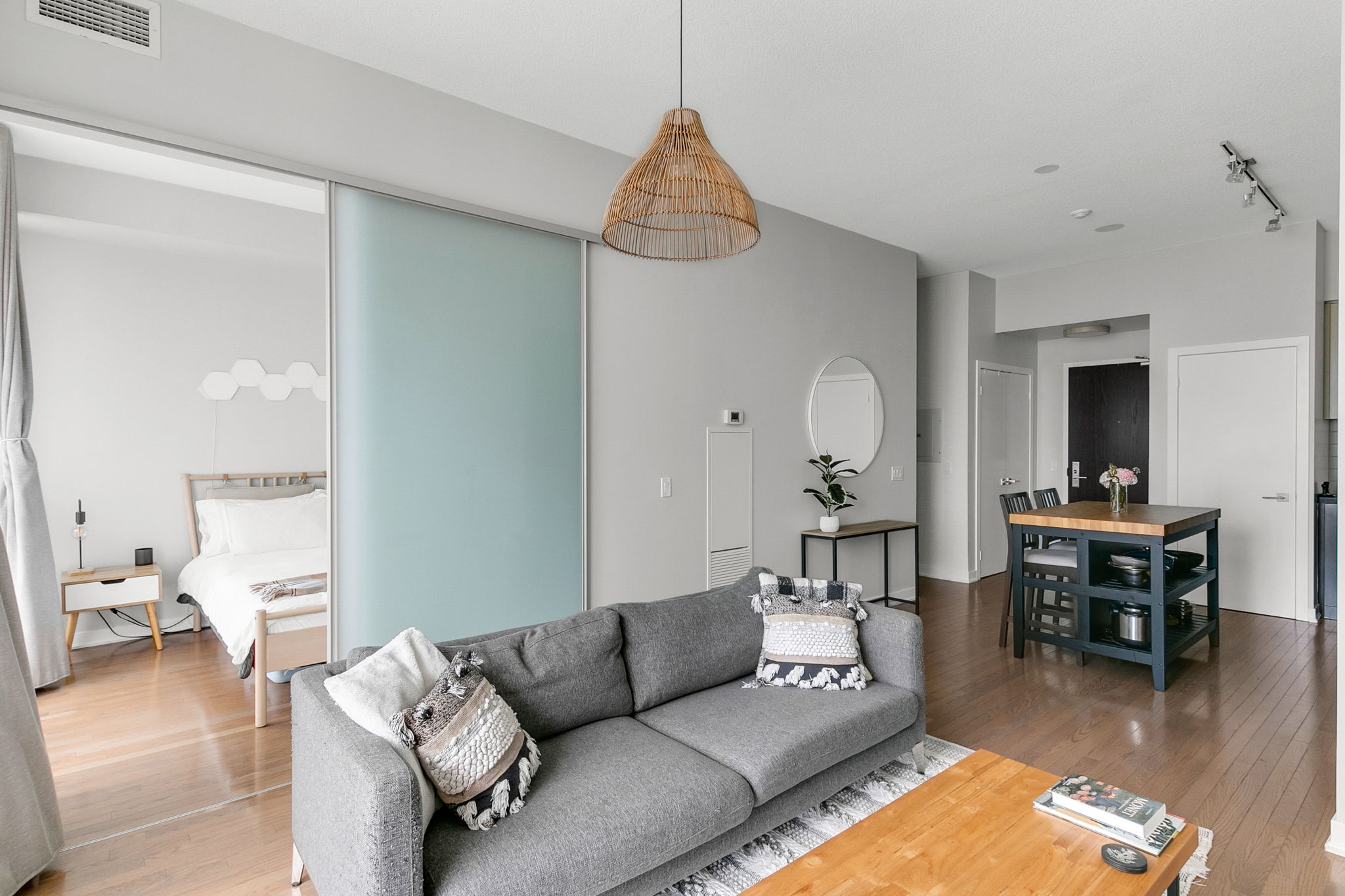 The layout is thoughtful: a real bedroom with floor-to-ceiling windows and a full-width closet behind mirrored sliders, a generous living area that connects to the outdoors, and a separate den large enough to host guests, house a Peloton, or become a private office—your pick. The open-concept kitchen is fitted with panelled appliances, an island with breakfast bar, and engineered hardwood floors that run seamlessly throughout the unit. Subtle upgrades, like designer light fixtures and custom wall finishes, elevate the feel without trying too hard.