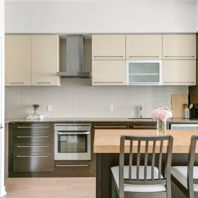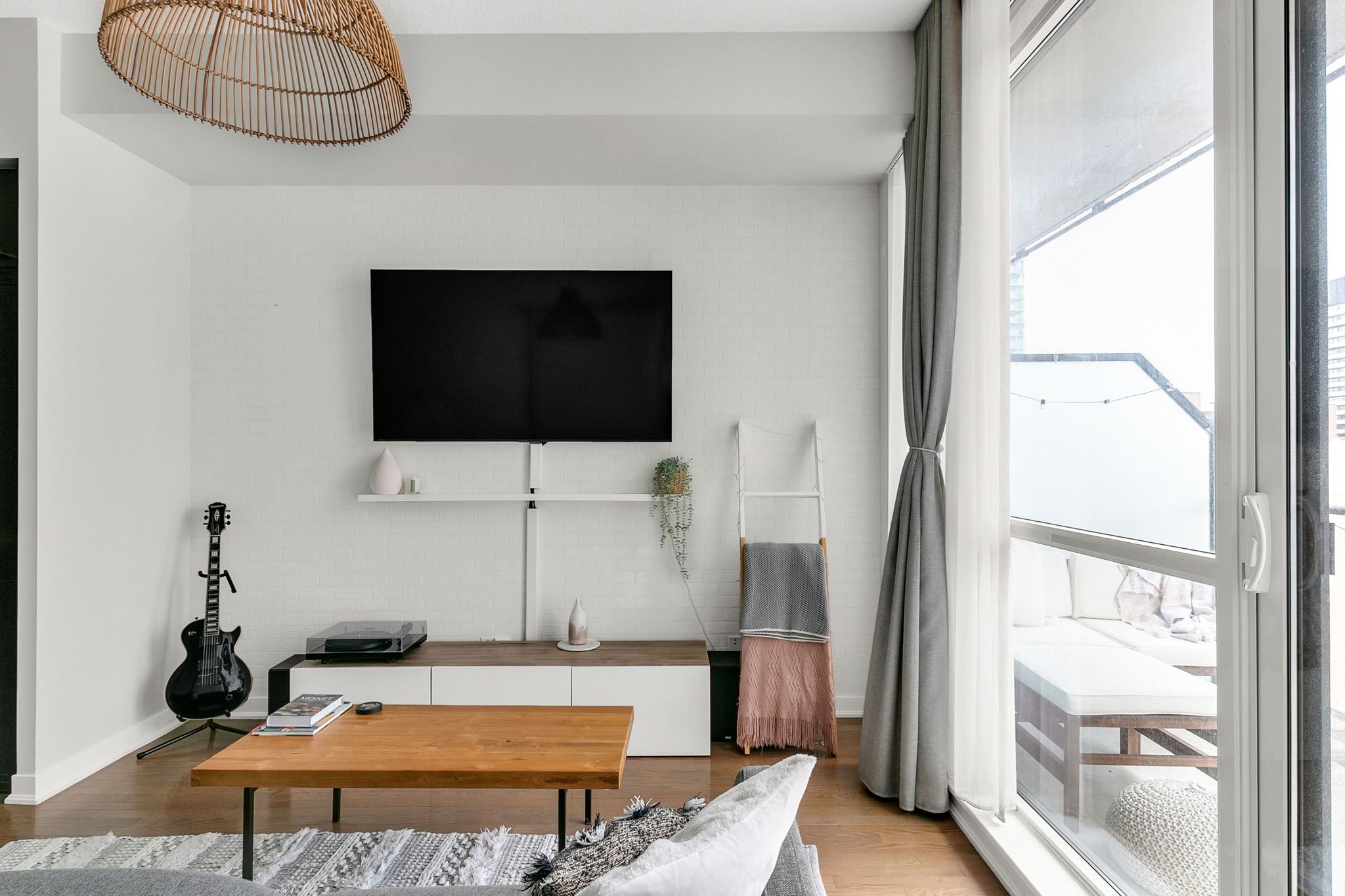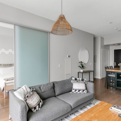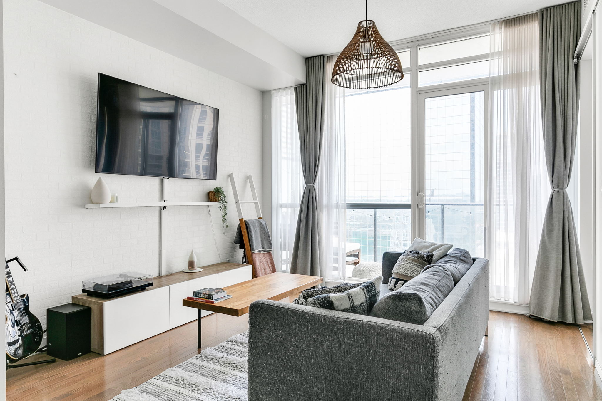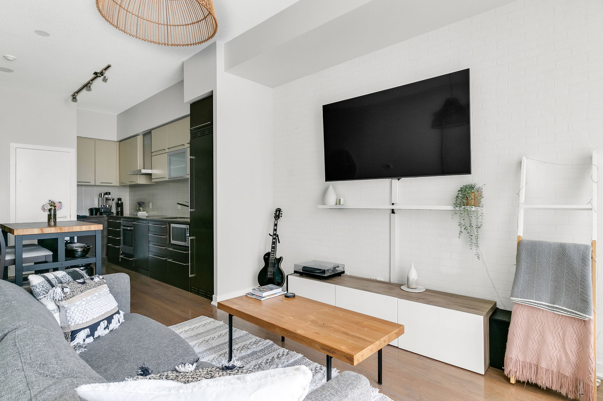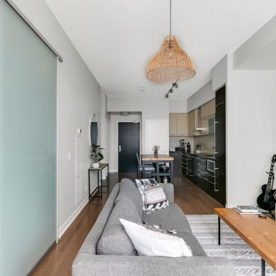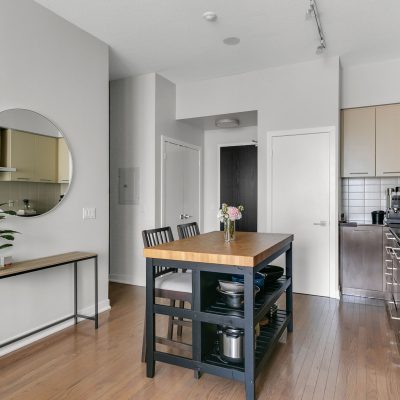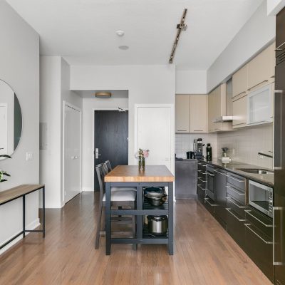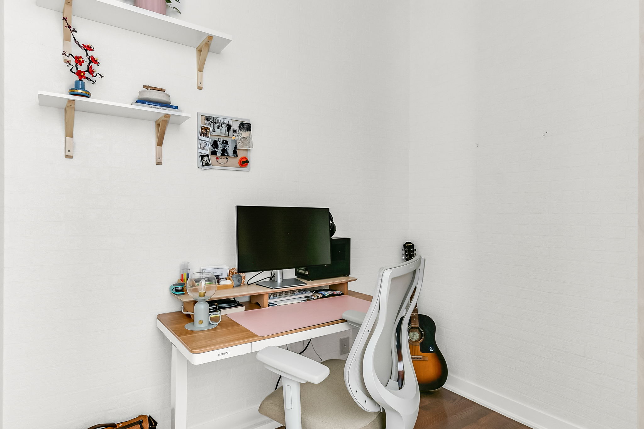 The layout is thoughtful: a real bedroom with floor-to-ceiling windows and a full-width closet behind mirrored sliders, a generous living area that connects to the outdoors, and a separate den large enough to host guests, house a Peloton, or become a private office—your pick. The open-concept kitchen is fitted with panelled appliances, an island with breakfast bar, and engineered hardwood floors that run seamlessly throughout the unit. Subtle upgrades, like designer light fixtures and custom wall finishes, elevate the feel without trying too hard.