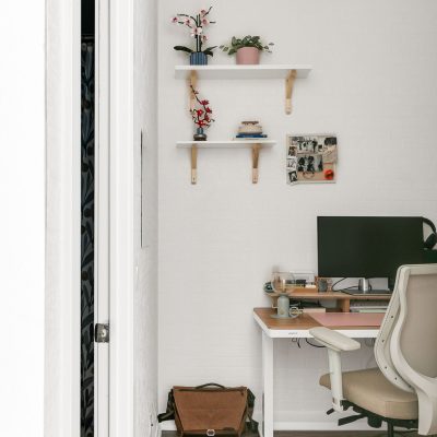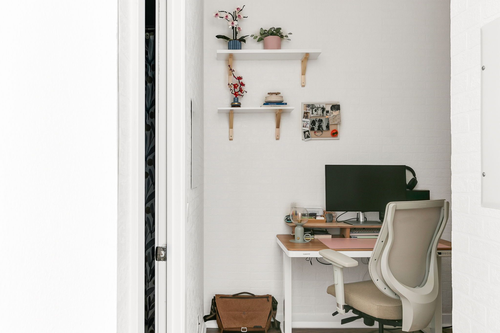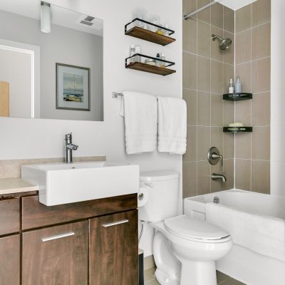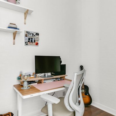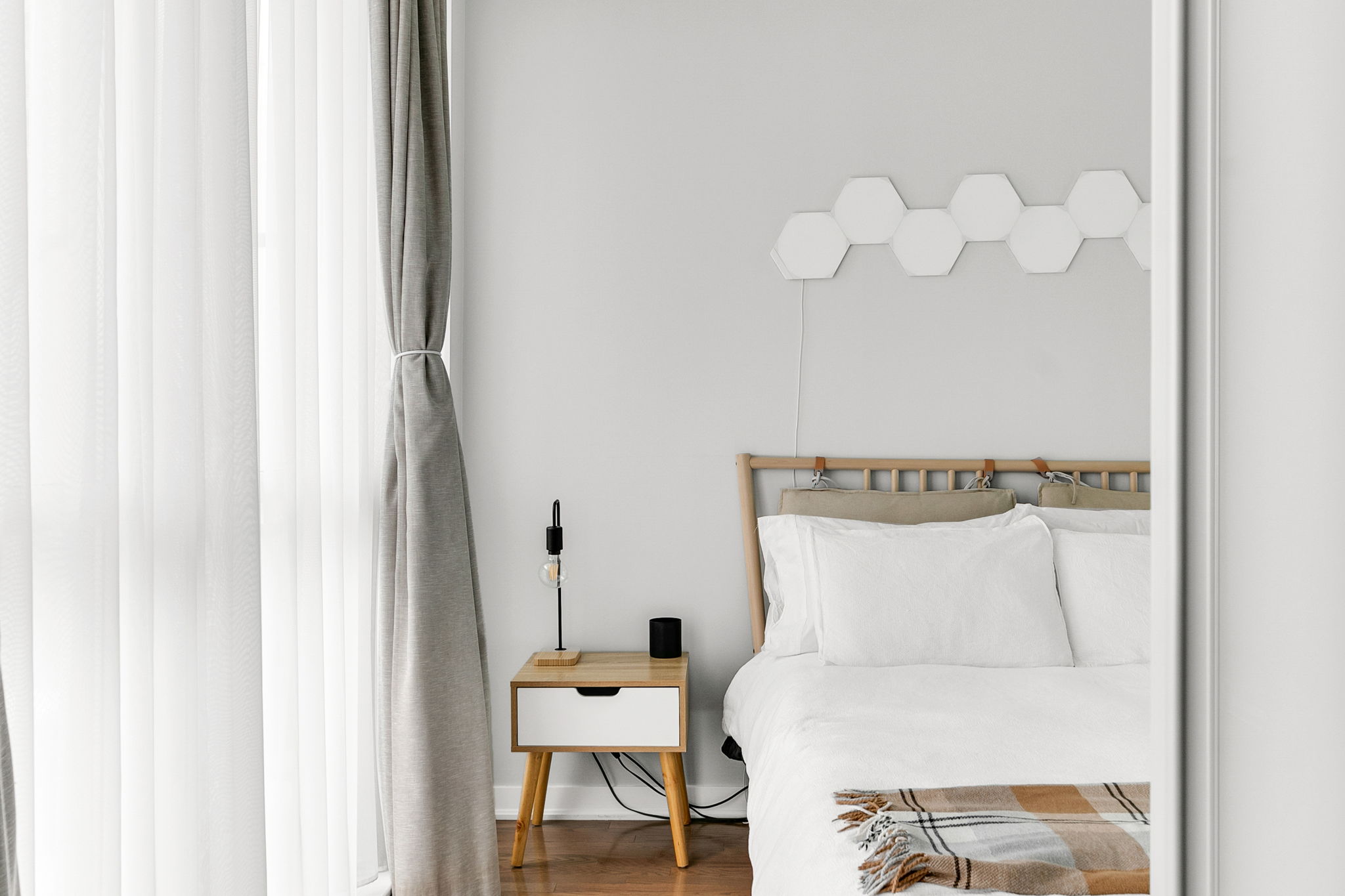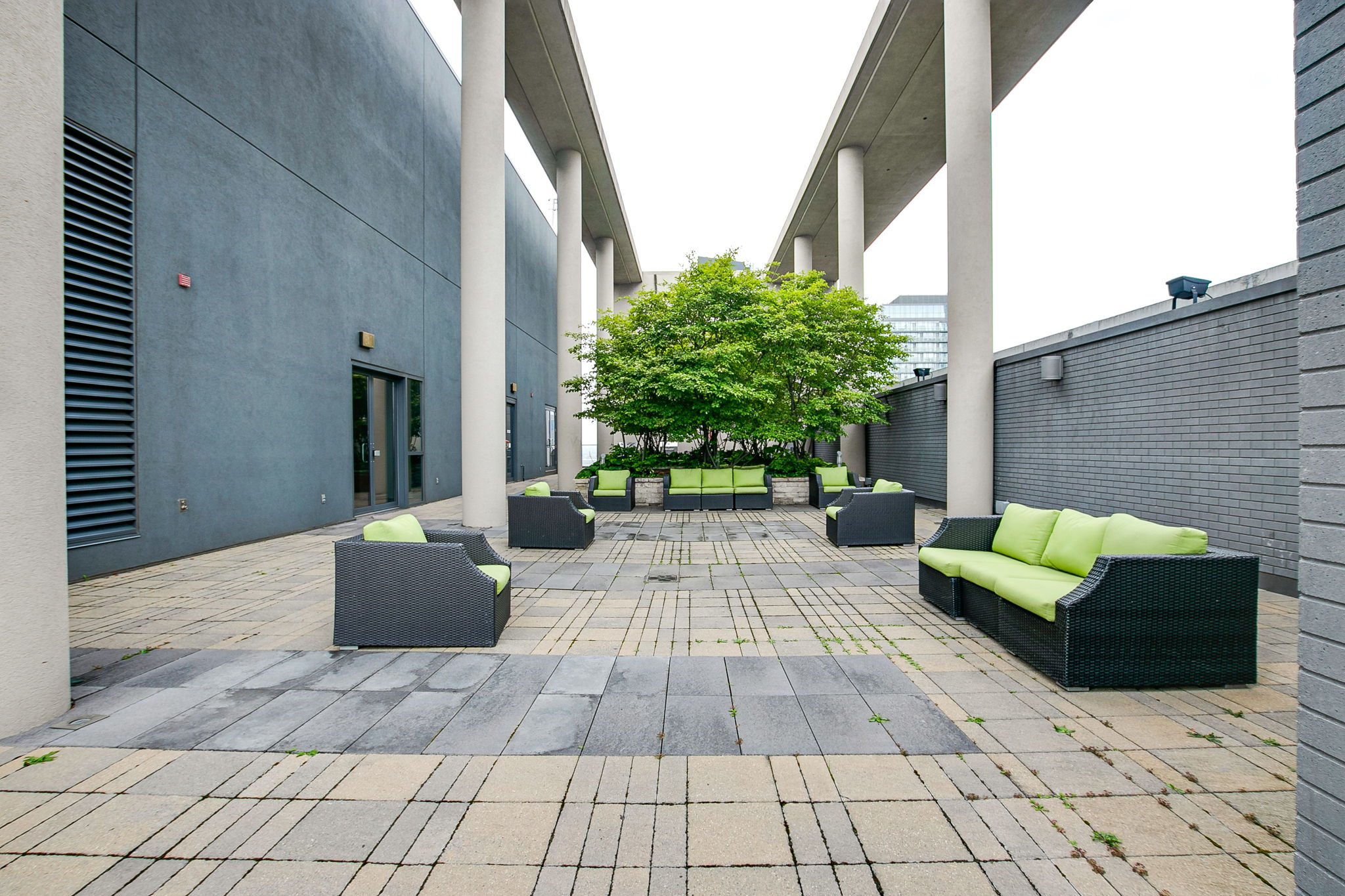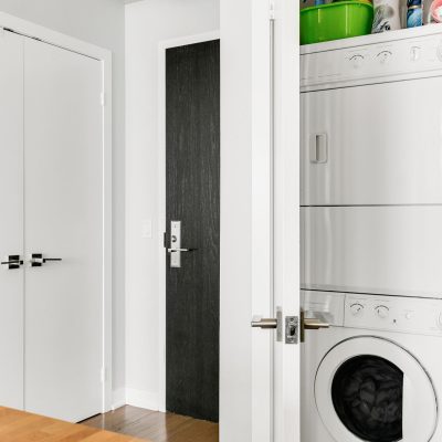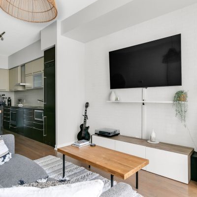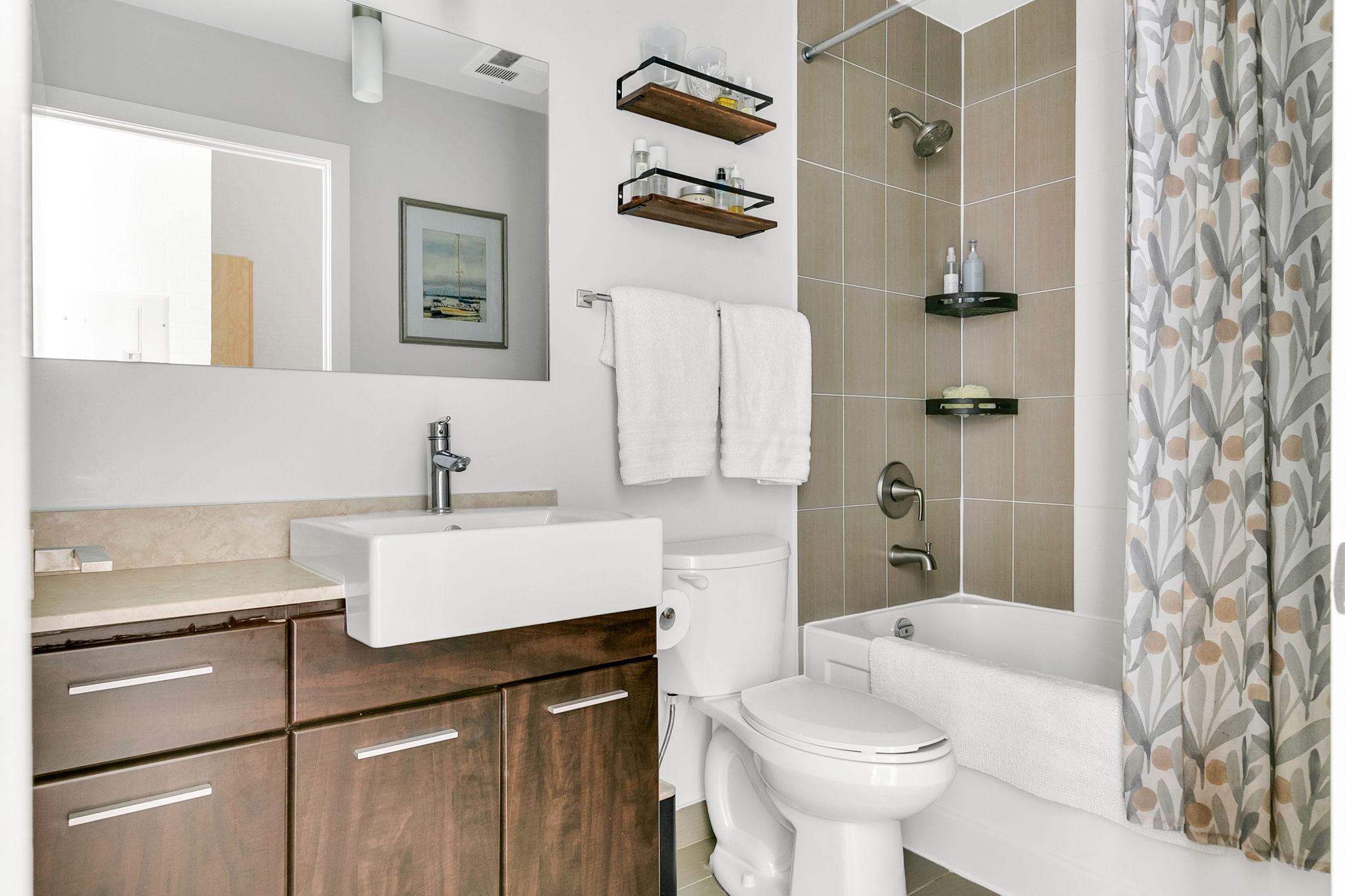 The layout is thoughtful: a real bedroom with floor-to-ceiling windows and a full-width closet behind mirrored sliders, a generous living area that connects to the outdoors, and a separate den large enough to host guests, house a Peloton, or become a private office—your pick. The open-concept kitchen is fitted with panelled appliances, an island with breakfast bar, and engineered hardwood floors that run seamlessly throughout the unit. Subtle upgrades, like designer light fixtures and custom wall finishes, elevate the feel without trying too hard.